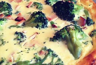 Verser l'appareil dans un plat à tarte beurré. Y ajouter les brocolis préalablement ébouillantés et les filets de poulet fumé coupés en petits morceaux.