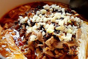7. Chauffez de nouveau l'huile dans le wok, faites revenir le gingembre, la ciboule et la pâte au soja fermenté et aux piments pendant 2 min à feu assez fort. Versez le bouillon de volaille, quand le bouillon commence a frémir, ajoutez les tranches de boeuf. Touillez constamment pour éviter que les tranches ne s'attachent entre elles. Ne portez jamais le tout àébullition. Quand la viande est cuite à point, mettez le sucre et la sauce de soja si ce n'est pas assez salé. Mettez le tout dans la marmite sur le chou. Gardez le plat au chaud. Hachez l'ail très finement.