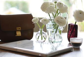 Ensuite, tout le monde le sait bien, on a tous une table avec de jolies fleurs, dans de jolis vases, avec un joli ordinateur et un joli sac, le tout joliment présenté, comme ça, naturellement.