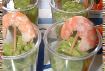 Présenter en alternant le saumon, l’avocat et terminer avec quelques crevettes décortiquées,et la tomate cerise.