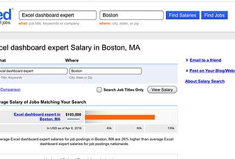Nombreux sont les professionnels qui peuvent présenter des données visuellement dans Excel mais très peu sont ceux qui peuvent réellement présenter des données d’une façon engageante, qui contribue à ce que l’entreprise prenne de meilleures décisions d’affaires ou sécurise des ventes, par exemple. Sur le site d’offre d’emplois Indeed, les postes affichés en ce moment pour les experts de tableaux de bord dans Excel offrent un salaire moyen de 103,000$¸, dans la région de Boston. Ce salaire est en dollars US. Les salaires sont sans doute un peu différents à Montréal qu’à Boston mais il s’agit néanmoins de marchés simialires et on peut penser qu’en dollars CAN, les salaires moyens se rapprochent. À noter que Le CFO masqué offre plusieurs formations sur les tableaux de bord dans Excel.