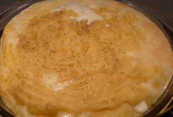 Une fois cuite, dans un plat allant au four, verser dans le fond et la paroi la polenta encore très chaude, ajouter la cancoillotte et terminer par de la polenta chaude.