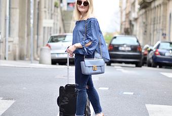 => Blouse en Jean She In=> Jean Effiloché Pimkie=> Sandale en Bois San Marina=> Lunettes de Soleil Bijou Brigitte=> Bracelet Éléphant Stella&Dot=> Sac Bleu Elsie Chloé=> Valise Noire Vernis Lipault