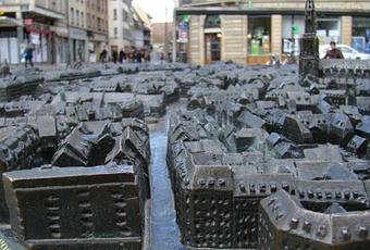 Point_de_convergence_Strasbourg_Place_AusterlitzC’est bon, je suis dans l’axe ? Je suis actuellement là où se trouve la flèche jaune. Plus précisément Place d’Austerlitz à Strasbourg où se trouve le Point de Convergence. C’est un plan en relief de la ville de Strasbourg réalisé par Christophe Fleurov à l’aide de l’artiste Allemand Egbert Broerken et de l’artiste Alsacien Raymond-E. Waydelich.