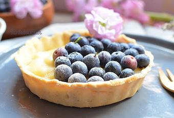 Mettre la crème tiède dans chaque tartelettes puis déposer les bleuets.Ajouter de la poudre de baobab.