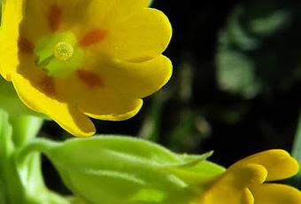 Primula veris subsp. veris (Primevère officinale, Coucou) : calice évasé verdâtre, corolle concave jaune foncé à 5 lobes portant chacun une tache orangée à la gorge, fleur odorante.