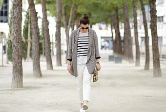 Mais en bonne serial shoppeuse qui se respecte, ou bien en éternel enfant qui a besoin d’étrenner tout de suite son nouveau jouet, à voir, je sais pas encore, j’ai pas choisi, j’ai quand même décidé de sortir mon pantalon blanc flambant neuf. Je sais pas ce qu’il en est pour vous mais perso je suis maudite (ou vraiment pas douée!) avec les pantalons blancs. S’ils parviennent à fêter leur premier anniversaire encore immaculés, c’est un miracle ! D’ailleurs j’avais presque décidé d’arrêter de les torturer en les laissant pendouiller dans les rayons de mes enseignes préférées en attendant qu’une bonne âme plus soigneuse daigne s’en emparer mais »flûte »! (choix du mot important, on sent bien la grosse exaspération avec »flûte »!) Après tout, moi aussi j’ai droit à mon bas blanc printanier/estival qui va avec tout et mieux encore avec ma collection scandaleuse de marinières !
