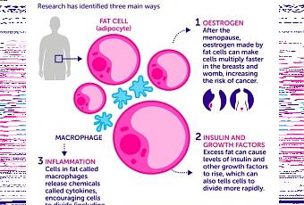 – Des niveaux d’œstrogène élevés : c’est probablement l’un des liens les plus forts entre l’obésité et le cancer et le facteur majeur de risque accru de cancers du sein et de l’utérus chez les femmes, surpoids ou obèses après la ménopause. Chez les femmes en pré-ménopause, les ovaires sont les principales cellules productrices d’œstrogène. Mais les cellules de graisse (adipocytes) peuvent accroître cette production d’œstrogène et, après la ménopause, lorsque les ovaires cessent de fonctionner, la graisse devient la principale source de production de l’hormone. De grandes études menées sur des cohortes de femmes ont ainsi démontré la relation directe entre l’obésité, les niveaux élevés d’œstrogène et le développement des cancers du sein et de l’utérus. D’autres études ont également montré que réduire les niveaux d’œstrogène permet de stopper le développement de ces cancers.