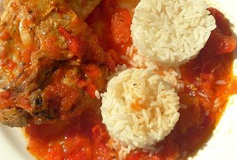 Les 20 dernières minutes, faites cuire le riz, puis servez le tout en présentant le riz à l'aide d'emporte-pièce.