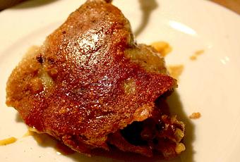 Le Confit de canard est une belle pièce, parfaitement cuite, bien saisie, la peau croustillante et, grâce à une sauce (secrète !) mise à la cuisson, la chair demeure tendre et ne sèche pas. Savoureux. Le champagne proposé, de chez J-M. Sélèque, brut peu dosé (5 g), accompagne gentiment le plat sans interférer vraiment. Pas l’accord de l’année mais plaisant et original.