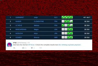 Chez les filles nous avons 2 françaises en finale avec la championne de France Clémentine Kaiser et Melissa Le Névé. Janja Garnbret a survolé les demi-finales, va-t-elle garder le même sans-froid en finales? Notons l’absence d’Anna Stöhr qui n’a pas atteint les demis. Akiyo Noguchi, vainqueur de la Coupe du Monde 2015 ne rate pas le coche.