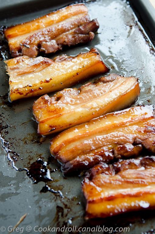 Faire mariner les tranches de lard dans le mélange de soja, mirin, et vinaigre de riz, pendant 12 heures au moins.