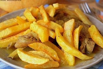 Pendant ce temps, laver les pommes de terre, les éplucher et les découper en frites puis les frire dans de l’huile chaude !