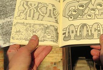 Omick nous plonge au cœur du secret de ses graffitis avec Ylyad Sisab, un livre qui reproduit fidèlement ses recherches quotidiennes sur papier. Les pages de ses esquisses sont gardées à l’échelle originale, sans modification dans la mise en page, et les traces du feutre ayant transpercé le papier au verso sont laissées visibles. Le feuilletage rend compte de la diversité et de la singularité des formes explorées par Omick chaque jour. L’exercice laisse une part à l’accident et l’incongru. Le souci du détail est poussé jusqu’à la reproduction du buvard maculé d’encre utilisé par l’artiste, qui devient le signet de cet ouvrage élégant et authentique.