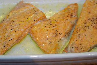 Pendant ce temps, badigeonnez les filets de truite d'huile d'olive, déposez-les dans un plat à four, salez, poivrez.