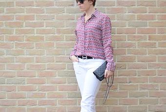 Shirt by Maje ; White denim by Isabel Marant Etoile ; Belt by Hermès ; Bag by Chanel ; Shoes by Gucci ; Sunnies by RayBan