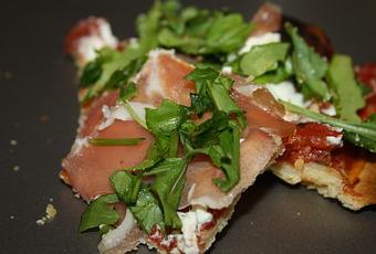 Quand elle est froide, tartiner la pâte de fromage frais. Découper le jambon en fines lanières et le répartir sur la pizza. Enfin, laver la roquette et la couper en morceaux et répartir sur la pâte.