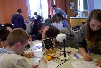 Des collégiens travaillent sur le TP panneaux photovoltaïque au premier plan tandis qu’un autre groupe, au second plan, réalise le TP éolienne encadré par Guillaume et Cyprien.
