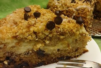 8. Pour the remaining batter into the pan. In a food processor or in a bowl, mix the ingredients of the Cream Cheese Mixture, add ¼ cup batter and beat well. Spread this mixture into the pan. Spread the reserved cup of batter over the Cream cheese mixture. Tap the pan on the work surface and sprinkle with the streusel. Bake for 55-60 minutes at 180°C or until an inserted toothpick comes out clean. Let the cake cool on a rack for 1 hour. Whisk the ingredients for the glaze in a medium bowl. Pour the glaze over the cake and decorate with chocolate chips