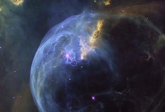Découverte en 1787 par William Herschel, l’objet surnommé la « nébuleuse de la Bulle » (Bubble nebula), de son vrai nom NGC 7635, est en réalité un vaste nuage en expansion d’environ 7 à 10 années-lumière de large – plus d’une fois et demie la distance qui nous sépare de Proxima du Centaure – situé à 7.100 années-lumière de la Terre, au sein de la constellation de Cassiopée. C’est un des rares à avoir été imagé par différents instruments qu’a connu Hubble tout au long de sa carrière : une première fois en septembre 1992 avec la caméra planétaire à large champ (WFPC pour Wide Field Planetary Camera), la seconde en avril 1999 avec la WFPC2 et enfin, en février 2016 (publiée le 21 avril), avec la WFC3. Cette fois, au contraire des précédentes, la Bulle qui est donc très étendue, peut être appréhendé dans son ensemble (l’image réunit quatre vues indépendantes).