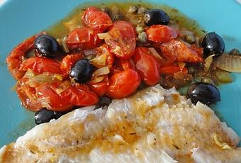 Ajouter les câpres et les olives égouttées, les morceaux de tomates, herbes, sel, poivre, et mouiller avec le vin blanc. Mélanger doucement et continuer la cuisson 10 mn afin d'évaporer partiellement le liquide et rendre les tomates tendres.