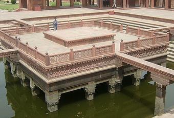 - Près du Divan-i Am, on peut voir un bassin appelé Anup Talao où quatre passerelles rejoignent une plate-forme centrale. C'est là que le plus grand musicien de la tradition indienne, Tansen, s'installait pour donner ses concerts. Les appartements privés d'Akbar se trouvaient à proximité.