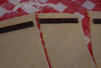 Sortir la pâte, l'étaler et façonner les petits pains en y mettant 2 barre de chocolat dans chacun d'eux.