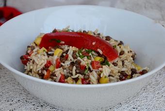 Mettre le riz, les lentilles, le maïs, les poivrons dans un saladier.