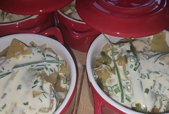 3.Pendant la cuisson, battre le jaune d'œuf avec la crème et la ciboulette. Verser dans le plat au moment de servir. Mélanger, vérifier l'assaisonnement et servir chaud.