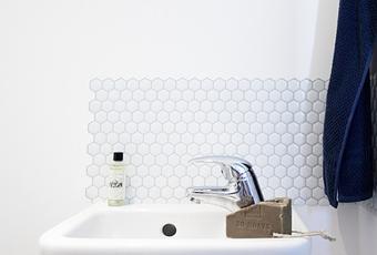 A l’époque, j’emménageais dans un nouveau logement (que je quitte ce we accessoirement!) dont les deux points d’eau (wc et salle de bain) n’avaient pas de crédence ! Non pas que je ne sois pas capable de faire attention (quoique !), il était évident qu’il fallait protéger les murs contre toute projection d’eau. N’étant pas propriétaire mais juste locataire, je voulais à la fois quelque chose de sympa, efficace, facile à poser pour pas payer l’intervention de qui que ce soit, mais également à déposer, sait-on jamais, esthétique évidemment, et raisonnable en prix. Dit comme ça, ça paraissait assez ambitieux comme recherche et finalement.. je suis tombée sur le site Smart Tiles et notamment sur leur produit Hexago que je trouve si mignon ! A la fois graphique et original et sobre et discret.. j’avais trouvé exactement ce qu’il me fallait !
