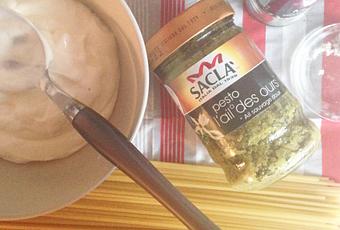 Pour ce premier test, je l’ai ajouté à des spaghettis. Il vous faut de la crème fraîche, une cuillère à soupe d’huile d’olive, 3 cuillères à soupe de pesto, sel et poivre.