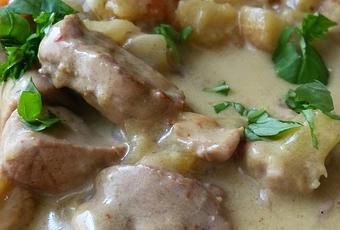 Ouvrir une boîte de lait de coco et en prélever un peu dans une tasse, qu'il faut mélanger avec une cuillerée à soupe de Maïzena. Verser dans la cocotte le lait de coco, les morceaux de porc, la tasse de Maïzena, la tomate et les dés de pomme. Saler et bien mélanger. Couvrir et laisser mijoter environ 45 minutes.
