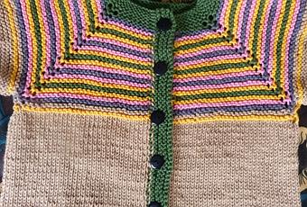 Au rang 5, chaque demi-devant augmente d'1 maille, les manches et le dos augmentent de 2 mailles. On recommence la séquence jusqu'à obtenir 24 trous-trous pour 48 rangs mousse rayé.