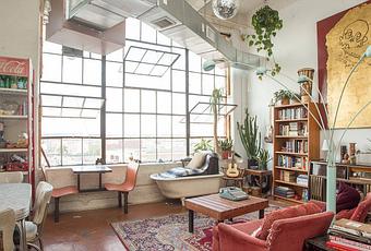 loft d'Ehren, un artiste musicien amoureux de la vie et des bonnes choses est bobo à souhait. Ce qu'il a fait de cet endroit est incroyable : une baignoire en guise de canapé, une boule à facettes au plafond, des vélos et un surf en cuisine, c'est bien connu : aux Etats-Unis, tout est permis ! C'est ce que j'adore dans ce pays ! On aime ou on déteste, c'est une affaire de goût, mais en tout cas, on ne peut pas nier que ce joyeux bordel fonctionne complètement ! Tous ces éléments qui interpellent matchent super bien entre eux ! Perso j'adore, et je me vois bien profiter d'un beau coucher de soleil sur les gratte-ciels dans cette baignoire :-)