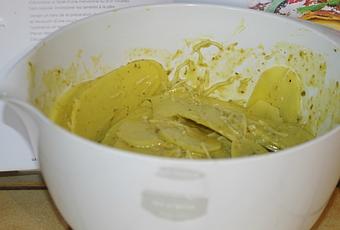 Laver et éplucher les pommes de terre. Les trancher dans le sens de la hauteur, en lamelles de 1mm d'épaisseur à l'aide d'une mandoline. Incorporer les lamelles à la pâte.