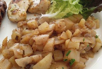 Pour 4 personnes : 750 g de pommes de terre, 2 navets, 3 oignons, 1 cs de pâte de tandoori, 1/2 botte de ciboulette, sel, 1 filet d'huile d'olive