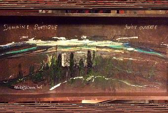 La poésie ouverte appartient au domaine poétique. Elle est l'émergence d'une poésie d'actions économes, succinctes et rigoureuses. Le Domaine poétique, 1963, c'est Brion Gysin et son poème I am what I am et Robert Filliou avec son Poème de 53 kg... Le domaine poétique finit par réunir en quelques mois les représentants de la Beat Generation, ceux de la Poésie sonore et ceux de la poésie concrète et bien entendu Robert Filliou et la poésie action. Dans ce tableau , un extérieur inconnu dérobé à une carte postale en noir et blanc du début des années soixante et fixée dans un tiroir à la teinte acajou, j'ai cherché à figurer les sons épars et maintenant oubliés de ces séances du Domaine Poétique qu réunissaient Filliou, Dufrêne, Maciunas, Williams, Knowles, Heidsieck, Gysin, Lucas, Chopin,... Une tentative picturale dans le Domaine poétique. Je m'éloigne du domaine politique mais je crois que cela est nécessaire pour retrouver son souffle tant l'aberration de propos tels que ceux de Cambadelis comparant la Loi Travail de El Khomeryi comme étant digne de celles des grandes avancées sociales annonce bien l'état de déliquescence dans lequel pataugent le PS et son gouvernement. De l'horreur politique passons à la beauté poétique. C'est une raison d'hygiène mentale.