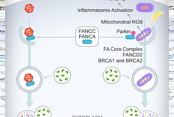 Les gènes des voies de signalisation propres de l’anémie de Franconi jouent un rôle dans la réparation de l’ADN génomique, et les mutations des gènes FA sont associés à une altération fonctionnelle de la moëlle osseuse et au cancer. Ici, nous montrons que les gènes FA (incluant BRCA1l FANCS et BRCA2l FRANCD1) sont requis pour autophagie sélective, qui supprime l’activation ROS-dépendante des inflammasomes mitochondriaux. La perte de fonction d’autophagie sélective médiée par FA pourrait contribuer à la pathophysiologie des maladies associées au gène FA.