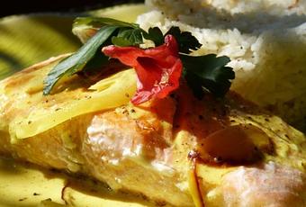Nappé d’une sauce au lait de coco ambrée, ce pavé de saumon se fait tendre, fondant et moelleux à souhait. Afin de poursuivre ce voyage gustatif, plein de saveurs et de couleurs, je vous invite sans tarder, à l’accompagner d’un riz parfumé au jasmin, ou pourquoi pas, Basmati.