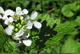 Alliaria petiolata (Alliaire) : herbacée bisannuelle à odeur d'ail ; tige robuste dressée très feuillue ; feuilles inférieures réniformes à long pétiole, feuilles supérieures cordées ; inflorescence en grappe terminale de petites fleurs blanches ; siliques dressées bosselées.