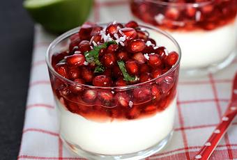 Il commence à faire beau , on a moins envie de manger de la compote mais plutôt des petits desserts frais qui nous font penser à l'été .... Je vous propose cette petite verrine composée de yaourt à la grecque , de grenade , de citron vert , gingembre , menthe et une touche de noix de coco ... En plus d'être beau , c'est très bon !!