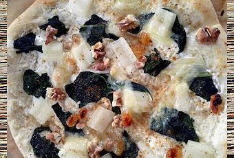 Étaler la pâte à pizza et y étaler le chèvre. Disposes les blettes sur l'ensemble de la pizza. Parsemer de cerneaux de