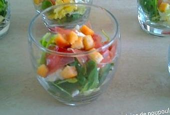 Oui je vous présente encore des verrines, mais vous savez que j'adore ça. J'ai présenté cette salade en verrine lors d'un apéro dinatoire, mais vous pouvez la présenter dans un saladier. Une petite salade qui a eu beaucoup de succès. J'adore le vinaigre de framboise dans mes salades.