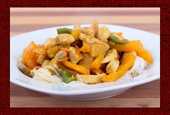 Lorsque la mangue a rendu suffisamment de jus et que le poulet est caramélisé, répartir sur les vermicelles et servir.
