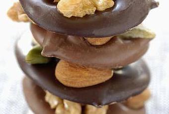 Déposer ensuite une pistache, une amande, un noix, une noisette et un raisin sec sur chaque cercle .