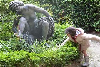 Quelle harmonie ! Les bottes grises de la mignonne curieuse renvoient au gris de la statue. Une diagonale relie l'opulente femme de bronze et la miniature brune vêtue de rose dragée. Et autour d'elles, le vert tendre des pousses de printemps.