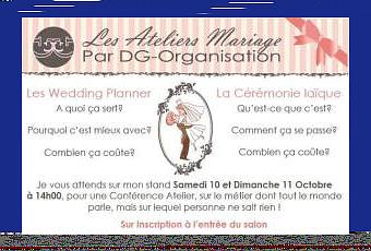 Chez DGO, Dominique Garay Organisation, on vous propose un très chouette atelier pour tout savoir du métier de wedding planner et de celui d’officiant en cérémonie laïque. Cela se passe samedi et dimanche à 14h00 !!