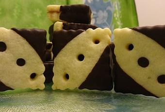 3. Fundir el chocolate al baño-maría. Pegar cada dos galletas con un poco de chocolate derretido. Sumergirlas en el chocolate y colocarlas sobre una bandeja cubierta de papel de aluminio.