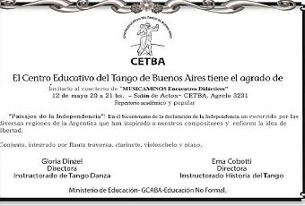 A l'occasion des festivités du bicentenaire de l'Indépendance de l'Argentine, déclarée à Tucumán, le 9 juillet 1816, le CETBA propose ce soir, jeudi 12 mai 2016 à 20h, dans ses locaux, rue Agüero, un concert où la musique des différentes régions du pays viendra célébrer l'idée de liberté !