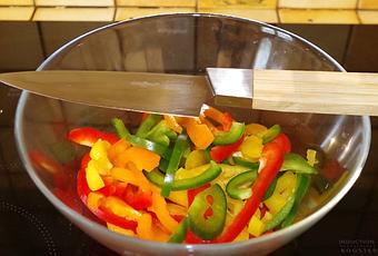 Passé ce temps, ajoutez les lanières de poivrons dans la sauteuse, montez un peu le feu, et faites-les revenir à feu moyen, en remuant souvent, environ 10min.